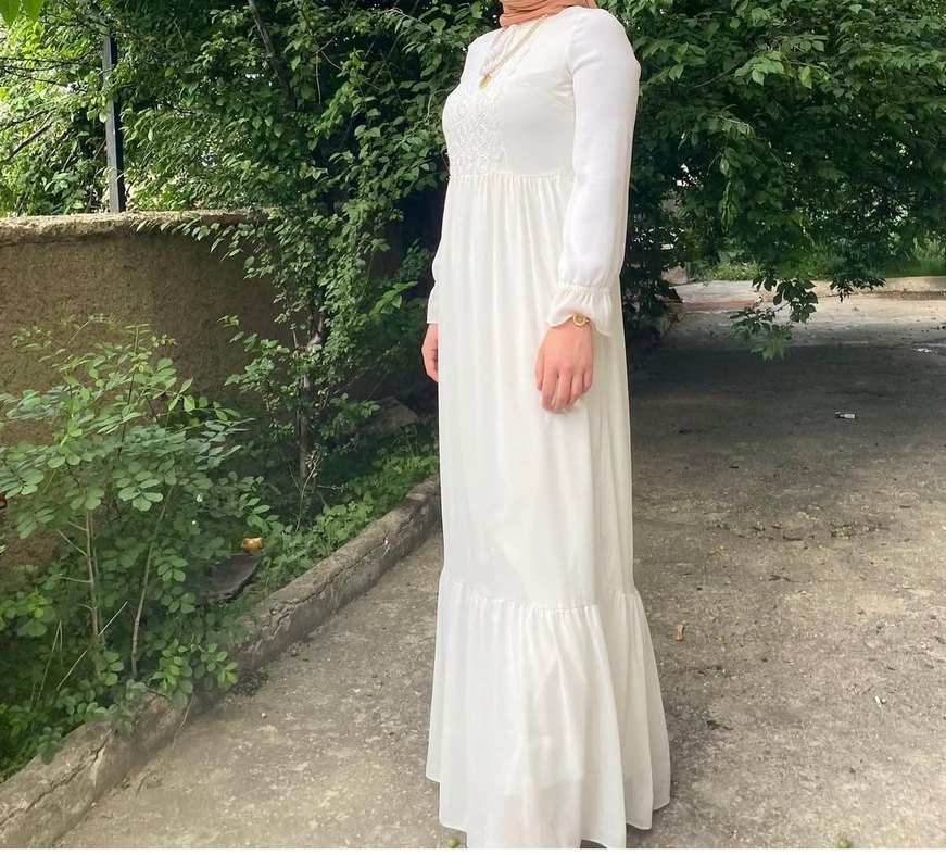 Beyaz, yüksek yakalı ve uzun kollu nakış detaylı uzun elbise. Sentetik kumaştan, bol kesim ve drapeli tasarım, bohem ve mütevazı tarza uygun. Düğünler için ideal.