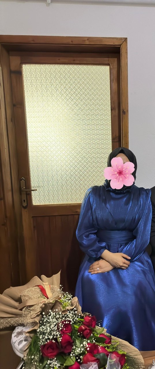 Bu mavi, uzun ve dar kesim elbise yüksek yakalı, drapeli ve bağlama desenlidir. Strappy kollu istememde bir kez giydim sonra hiç giymedim kalıp olarak çok dar 38 beden giymeme rağmen 42 anca olmuştu hasarı yoktur tertemiz durmaktadır