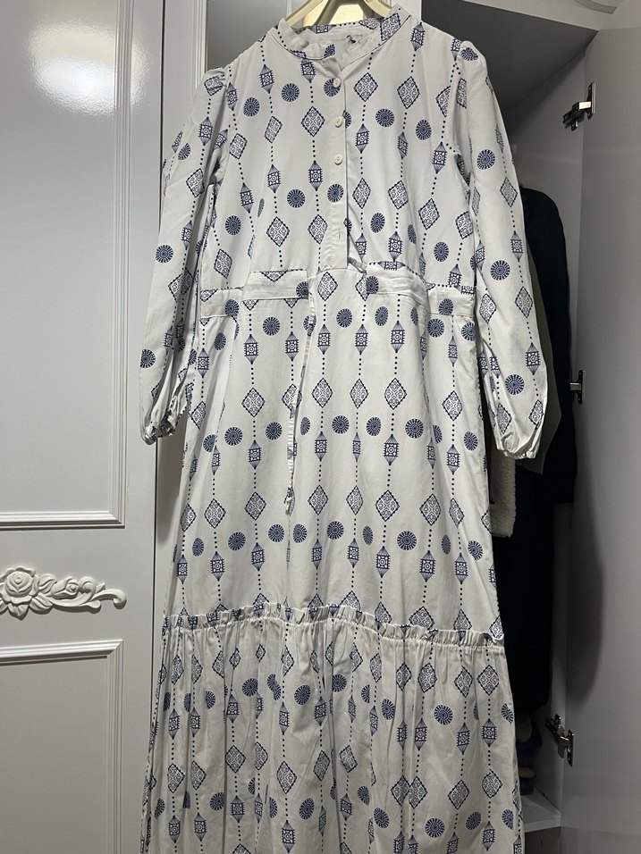 Uzun, bol kesim elbise, yüksek yakalı ve fırfır detaylıdır. Yumuşak sentetik kumaştan, gri beyaz batik desenlidir, bohem tarzı için uygundur.