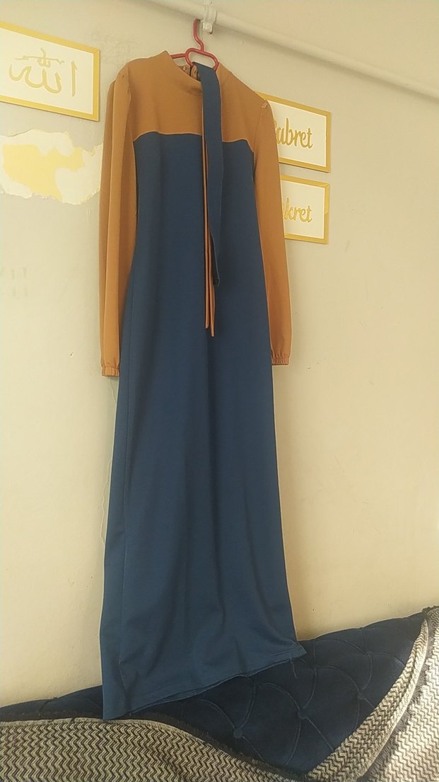 iki renkli tesettür elbise günlük kullanıma uygun kemer detaylı ve boyun kısmından kurdeleli