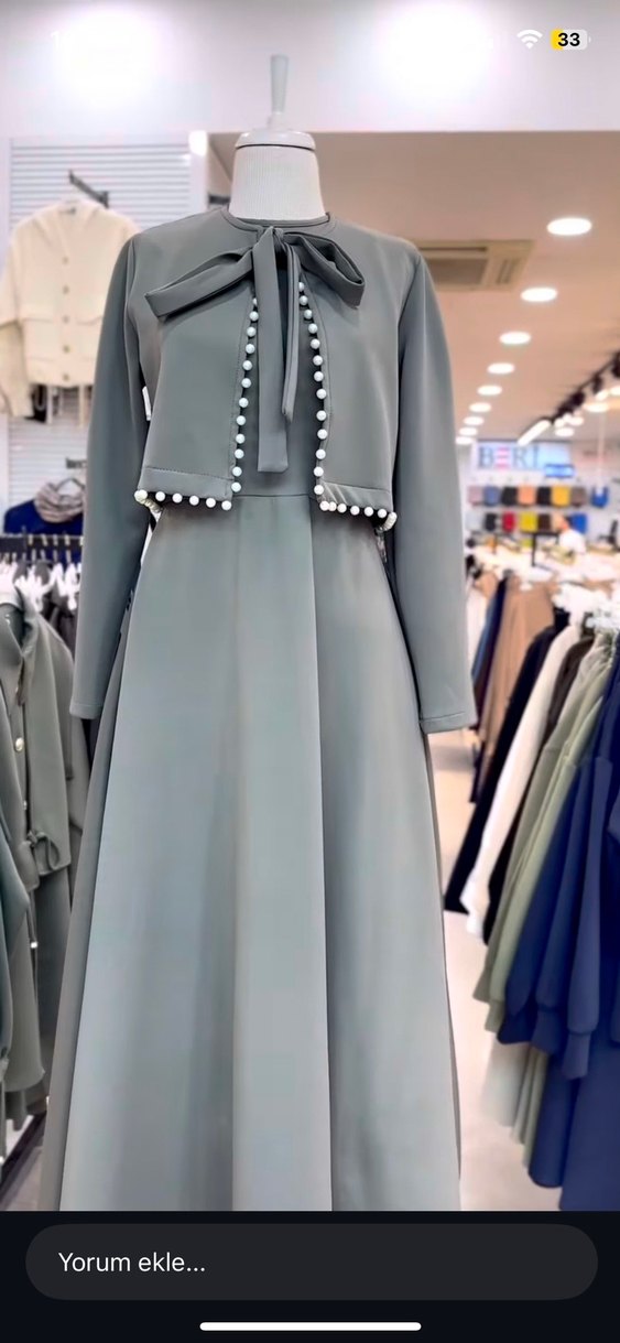 Sentetik kumaştan, yüksek yakalı ve uzun kollu, nakış işlemeli salaş uzun elbise. Yeşil renkte, günlük kullanıma uygun gotik avangard tarzda. Eşarp dahil