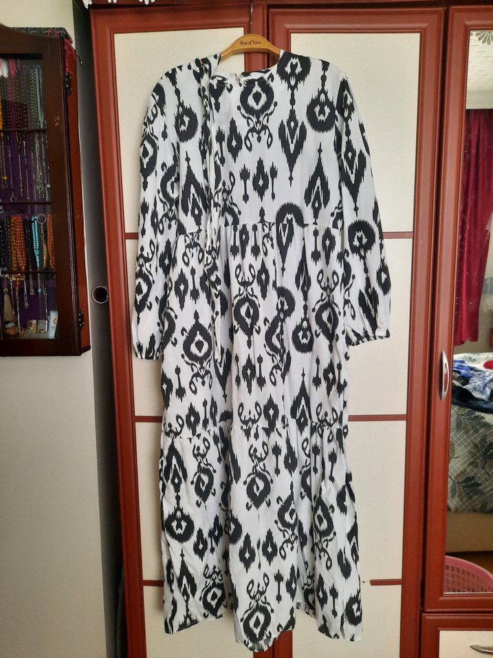 Uzun, salaş kesim elbise, drapeli ve V yakalıdır. Uzun kollu olup, gri-beyaz batik desenlidir. Yumuşak sentetik kumaştan üretilmiştir. Hiç giyilmemiştir. Geniş geldiği için satıyorum. Etiketknde L beden yazıyor ancak 42 44 bedene kadar olacağını düşünüyorum