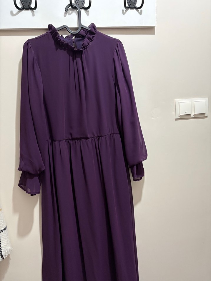 Uzun mor elbise, yüksek fırfırlı yaka ve uzun kolludur iki defa giyildi defosu yoktur m beden uyumludur kolları fırfırlıdır uçuş uçuş kumaşa sahiptir