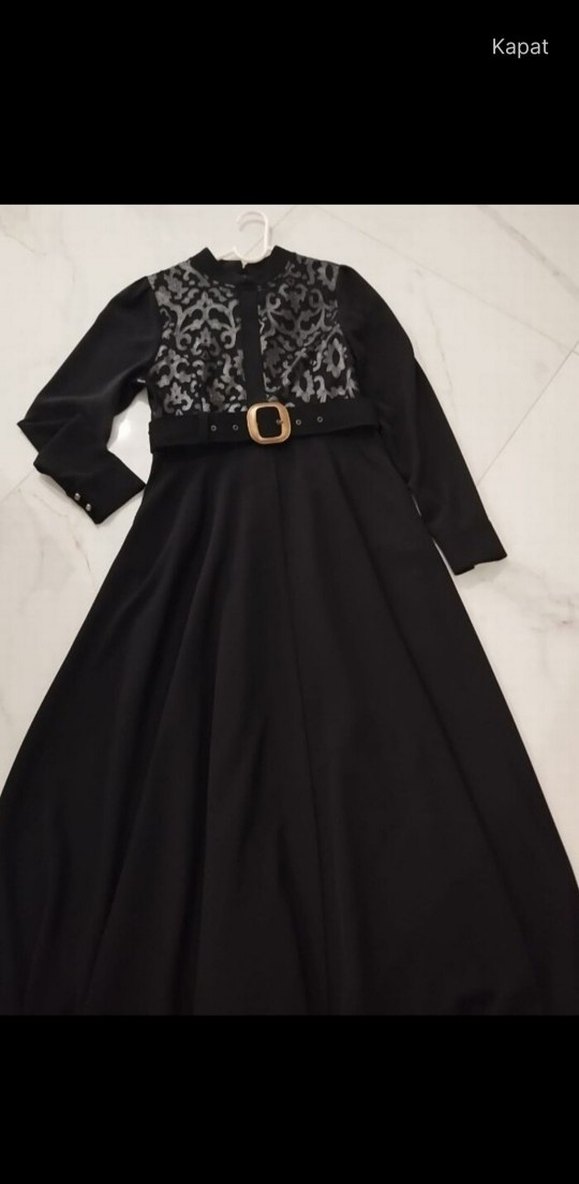 Kemer detaylı, yüksek yakalı ve uzun kollu siyah uzun elbise. Desenli üst kısmı ve klasik gotik tarzıyla öne çıkar. Rahat kesimlidir. 42 bedendir