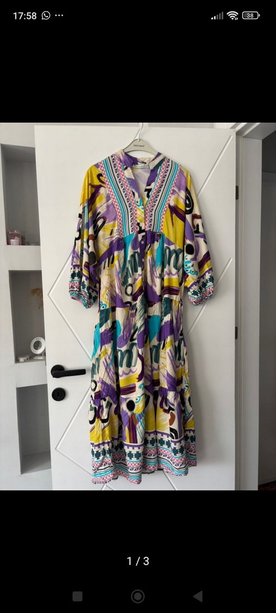 Renkli tie-dye desenli, uzun ve bol kesim elbise. V yaka, püskül detayları ve askılı kollara sahip bohem tarzda günlük kullanım için uygun.