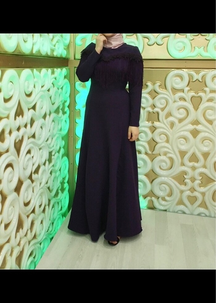 Elbise koyu mor renk 2-3 defa giyilmistir. Herhangi bir kusuru yoktur Gögüs kisminda dantel ve püskül detayi mevcut sirt ve kol kisimlarinda da dantel ve püskül mevcuttur Marka temsilidir