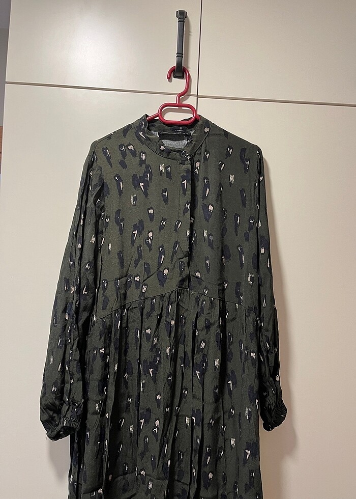 Astarsız iç göstermez önden yarım düğmeli. Seyyar kuşaklı. Haki yeşili 1.40 cm elbise boyu 1 beden 36-38-40 uyumlu ben 70 kilo ile giydim boy 1.68 Hiçbir sorunu yok