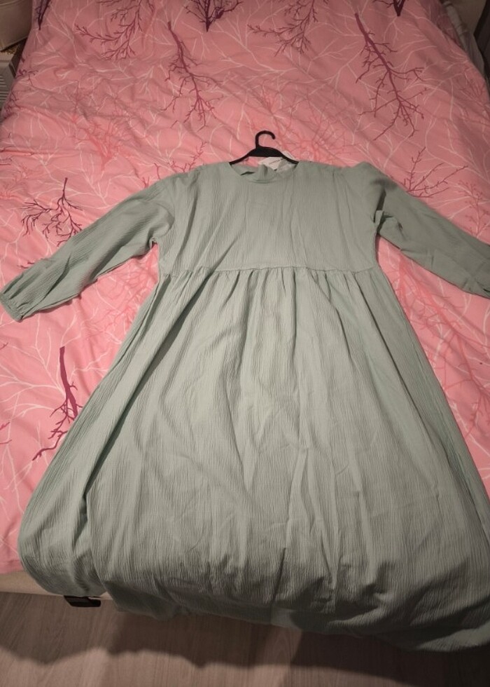 Hiç gitmedim etiketi üstünde duruyor geniş kalıplı rahat bir elbisedir