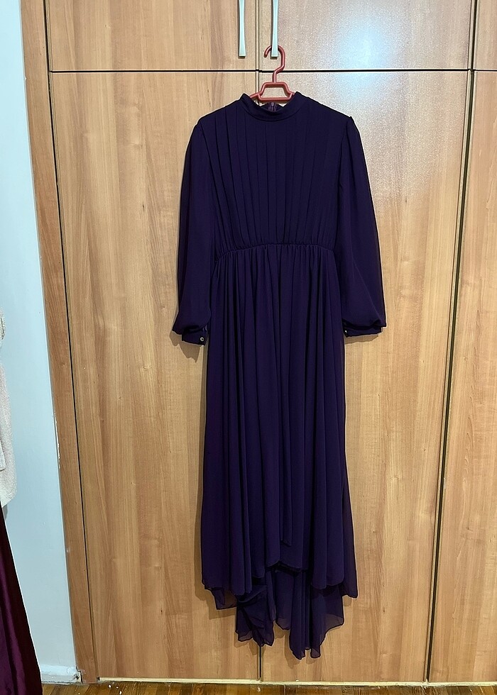 Kuşağı var. Beli lastikli içi astarlı uzun arkası kuyruklu elbise. Ablamın nişanında giydim. Büyük geliyor.