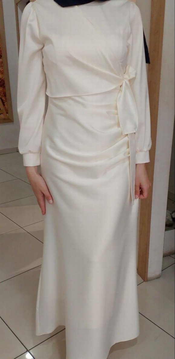 Uzun kollu, beyaz renkli bu elbise, tekne yakası ve klasik modern tarzıyla şık bir görünüm sunar. Regular fit ve zarif drapeler içerir. 40 beden 1.73 boyda mezuniyette bir kez kullanıldı