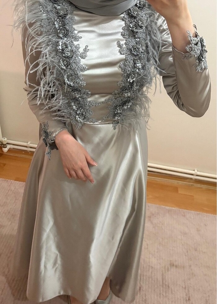 Gümüş rengi tok saten kumaş önü kısa arkası biraz daha uzun şık bir elbise. 36beden için uygundur.