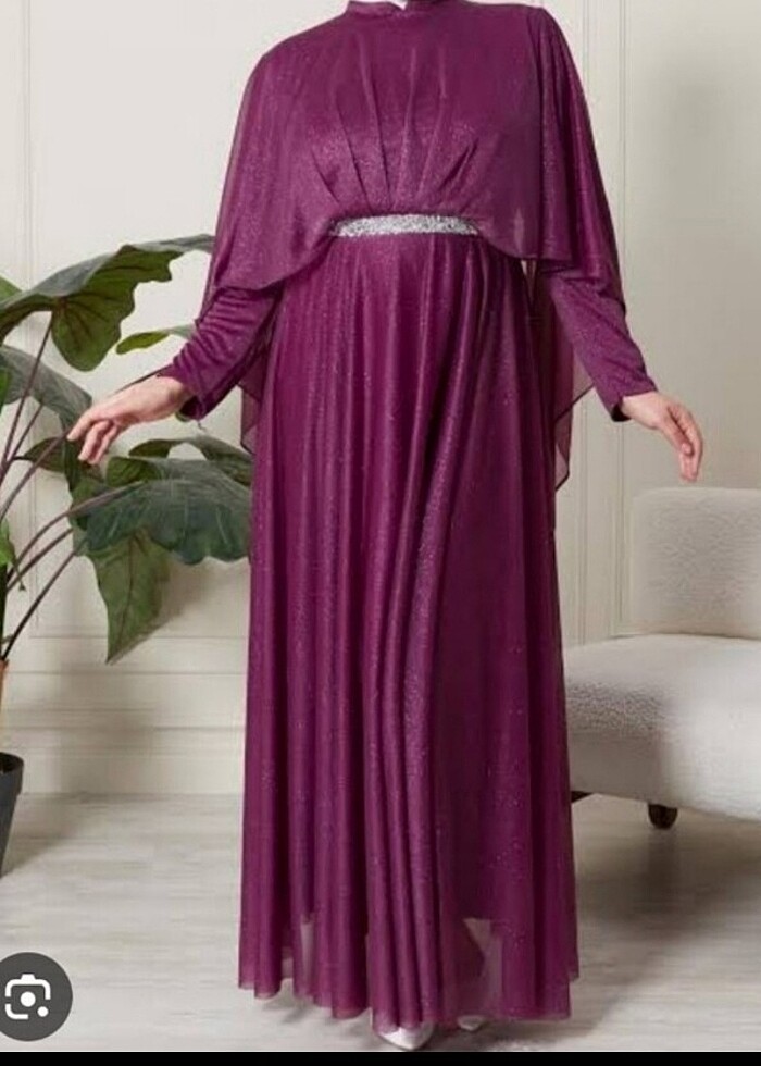Mürdüm rengi belinde kemeri olan pelerin detaylı tesettur elbise, göğüs kısmında ped mevcuttur. Bedeni 42 indir amcak 44 bedene de rahat olur esnek bir elbise. 1 kere düğünde kullanıldı