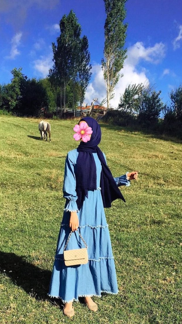 Pastel mavi tonlarda, uzun kollu ve yüksek yakalı, bol kesim denim elbise, fırfır detaylıdır. Günlük rahat ve mütevazı kullanım için uygundur.
