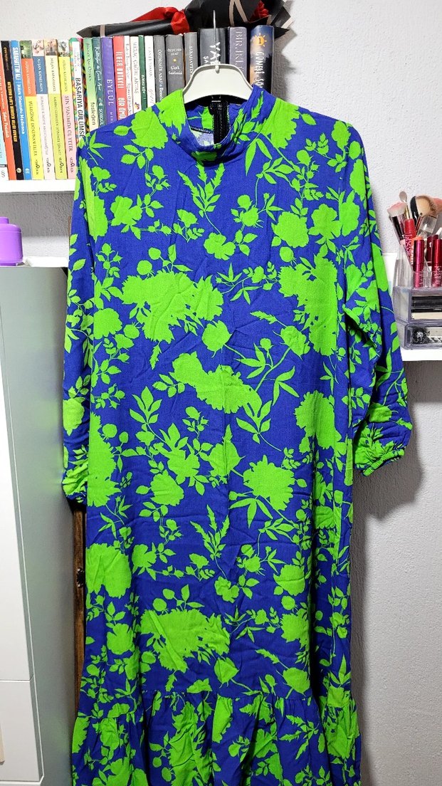 Uzun boylu ve bol kesim, dik yakalı ve fermuar detaylı, yeşil ve mavi çiçek desenli elbise . Detayları görsele ekledim iki kol arası 60 cmdir, elbisenin boyu 136 cm.