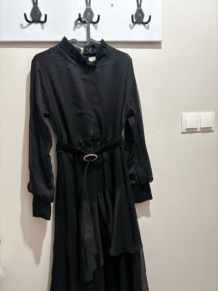 Uzun siyah elbise 38 beden uyumludur fırfır etek detaylıdır 2 defa giyildi hiçbir kusuru yoktur kemeri mevcuttur