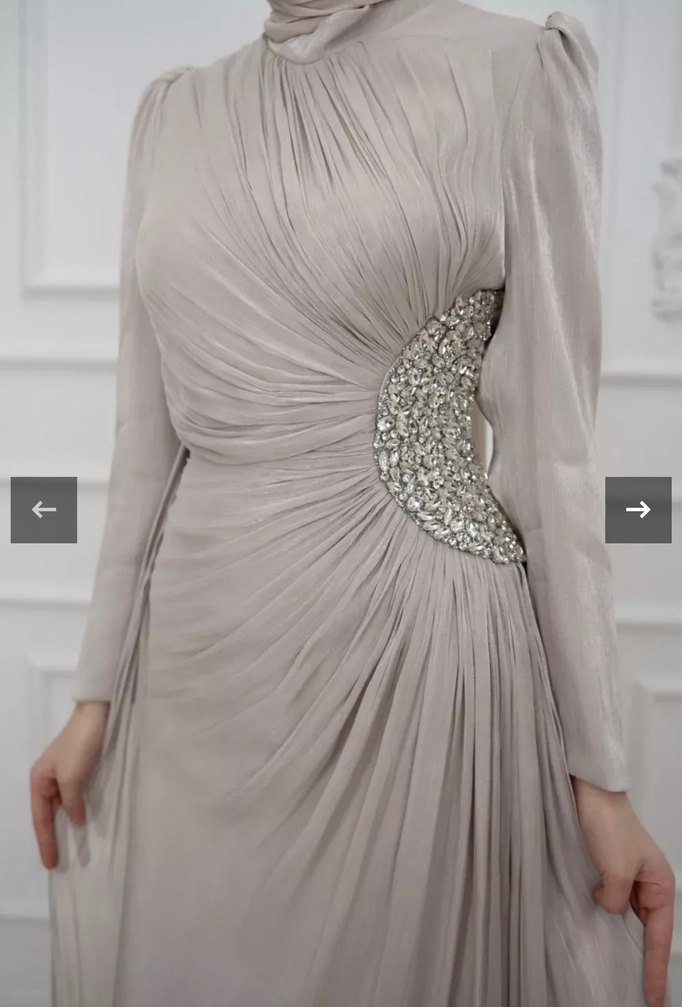 Yüksek yakalı, uzun kollu bu bej abiye elbise, şık drapeleri ve ışıltılı yan detayıyla düğünler için uygundur krem renk elbise.