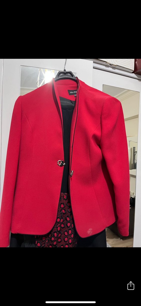 Kırmızı mini blazer, düğmeli ve kesimli yakaya sahip. Uzun kollu, kısa boylu ve yumuşak, sıcak kumaştan üretilmiştir. Ofis için uygun parlak görünümlü ceket ve elbise. Kardeşimin sünnetinde 1 defa giyildi alana hayırlı olsun sıfır üründür.