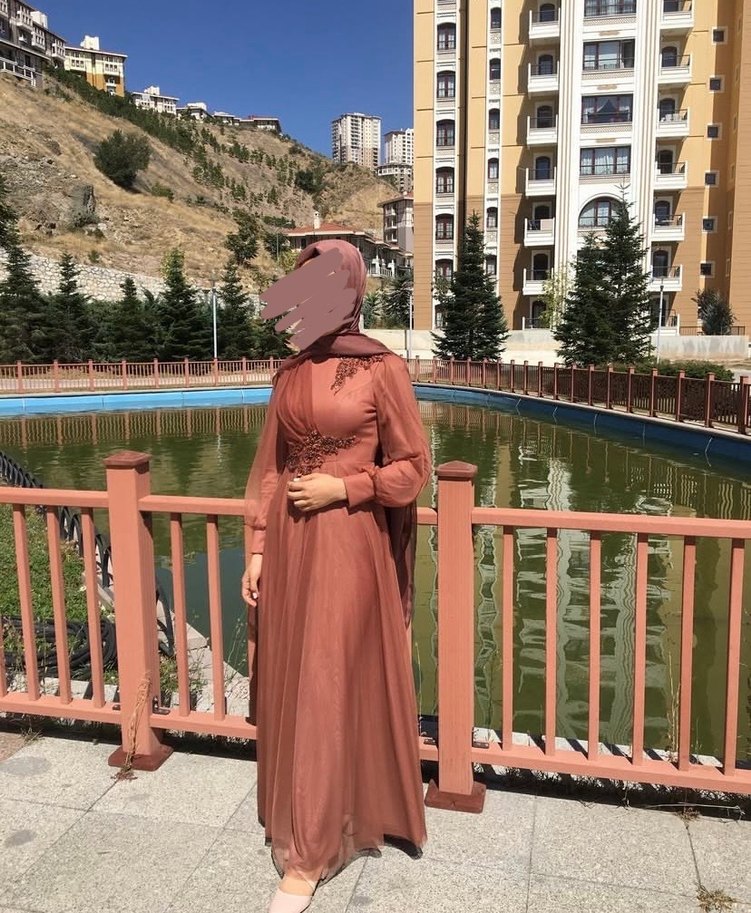 Kahverengi, uzun kollu ve yüksek yakalı, drapeli, tesettürlü ve bohem tarzda, düğünler için uygun, vücuda oturan uzun elbise.