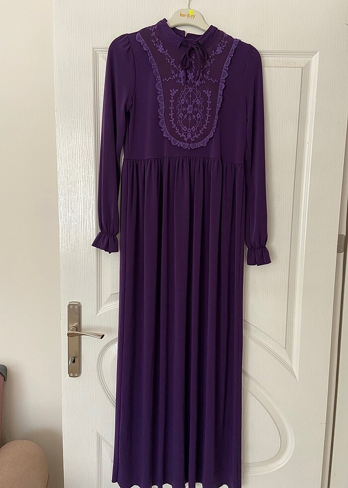 S beden mor renkli çok rahat bir elbise . Çok giymedim gayet iyi durumda . Göğüs kısmından dar geldiği için satıyorum .