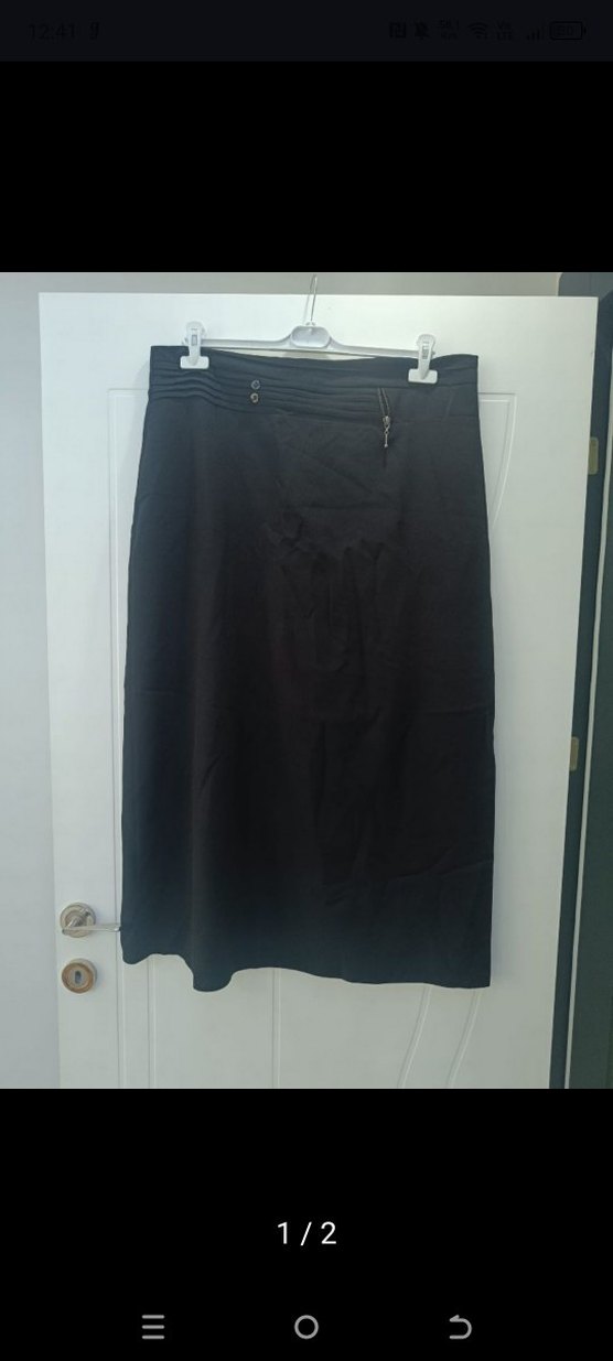 Siyah renk, midi uzunlukta, kemerli, düz desenli ve sentetik kumaştan yapılmış iş ortamına uygun goth tarzı kadın eteği.