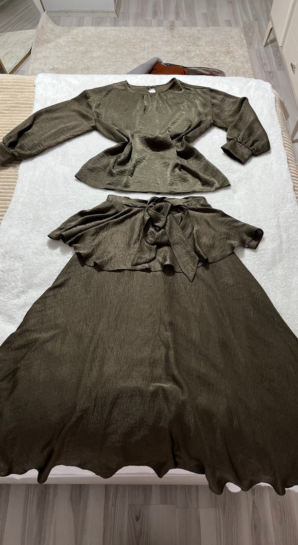 Özel günler için uygundur üste çok şık duran çok tarz bir üründür rengi güzel bir yeşil tonudur eteğindeki kemeri istediğiniz şekilde bağlayıp kullanabilirsiniz etekte arkadan gizli fermuar detayı bulunur kumaşı kıran kumaş değildirme beden ile uyumludur bel kısmı 38 santim etek boyu 96 santim bluz boyu omuzdan aşağı71 santim parlak yumuşak kumaş kumaşı çok şık duran bir takımdır. Sadece bir kere özel bir günde giyildi hiçbir kusuru defosu vs yoktur yeniden farksız