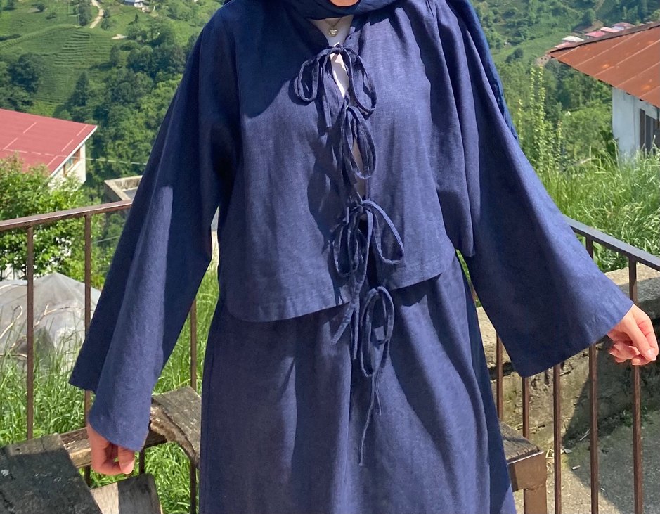 Lacivert keten , bol kesim, yakalı ve uzun kolludur. Bağcıklı, dökümlü tasarımı ile açık hava için uygundur.