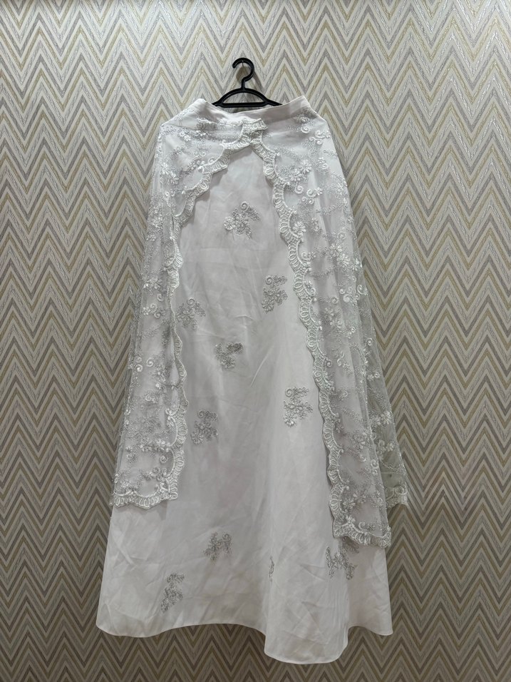 Üstünde dantel işlemeleri olan bir katmanı vardır. Özel dikimdir, gelinlik etek, üst ve duvağı olmak üzere 3 parçadır. Eteğin boyu tamamen 130 cm’dir. Gelinliğin sadece sol kolundaki dantelde minik bir kayma var, fotoğrafta belirtildi. Beden olarak 69 kilo, 1.65 boya göre dikildi. 40-42 beden.