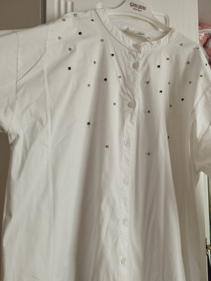 taş detaylara sahip, düğmeli ve kısa kollu beyaz gömlek. Salaş kesim bohem ve minimalist tarzda. çok şık duryo düğünlerde veya günlük hayatta giyilir bir kere gyldi