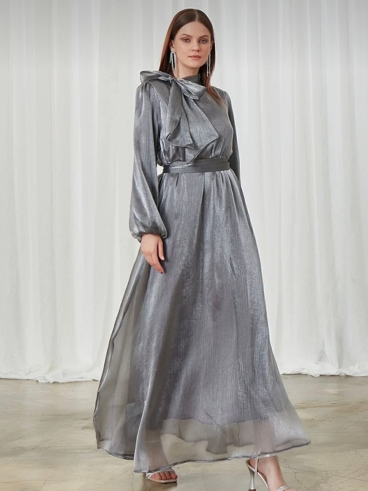 Tesettür Gri Abiye Elbise + ŞAL DAHİL L/XL 2 Beden