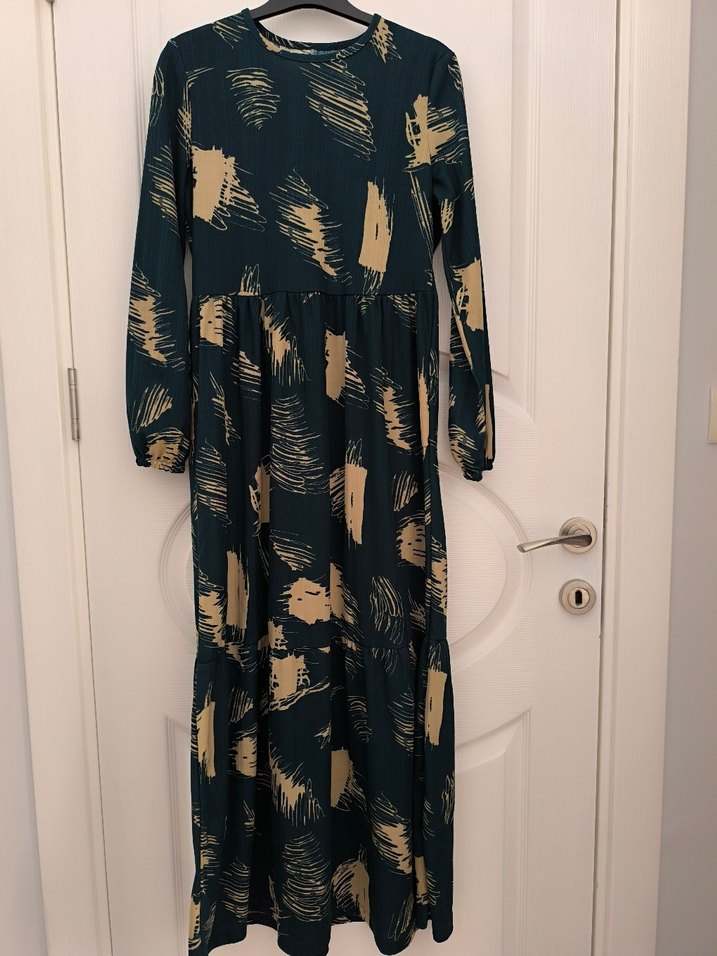 Yumuşak sentetik kumaştan, koyu renkli fırça desenli, yüksek yakalı, uzun kollu, bol kesim ve piliseli uzun elbise. boy 134 bel 38 cm