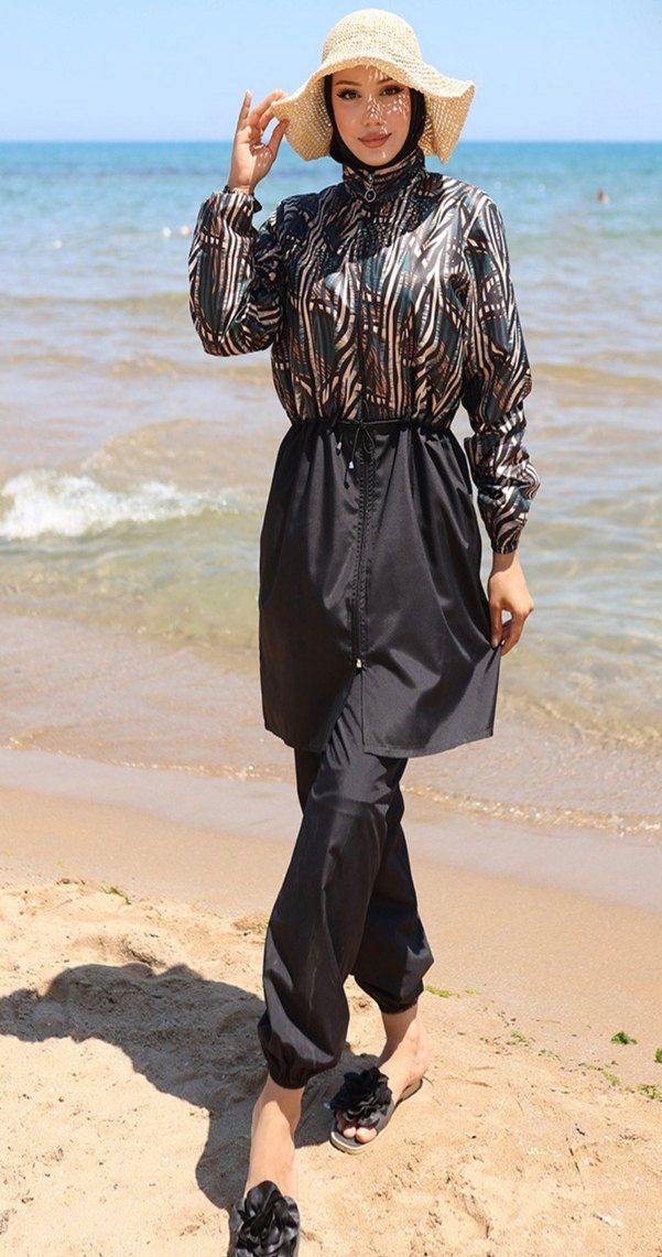 Uzun, bol kesim, yüksek yakalı, bağcıklı bel detaylı, çok renkli tie-dye desenli kadın haşema, uzun kollu, bone ürüne dahil değildir.