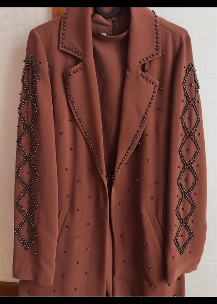 Kemal Aydın marka.Bu ürün özel numune tasarımdır piyasada yoktur. Efsane incili tasarım cekettir. İnciler çakılıdır dikme asla degil yani düşme sökülme olmaz. Sıfır kollu icligi vardır. Ceket astarlıdır. Yalnızca ceketin etek ucunda sökülme var terzide yapıştırmanız gerekiyor. 1 defa giyildi. Boyu 122 cm.