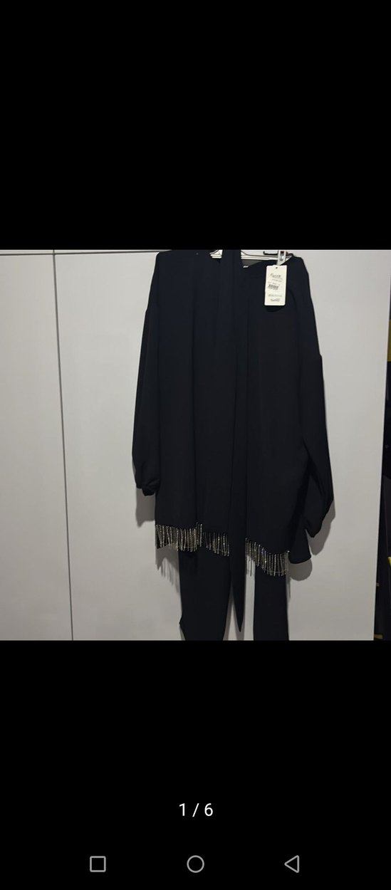 Bu siyah kadın tunik, uzun boy ve bol kesime sahip olup sentetik kumaştan üretilmiştir. Uzun kollu, yakasında yaka detayı ve etek ucunda püskül süslemeleri bulunur, gotik tarzda ofis için uygundur.