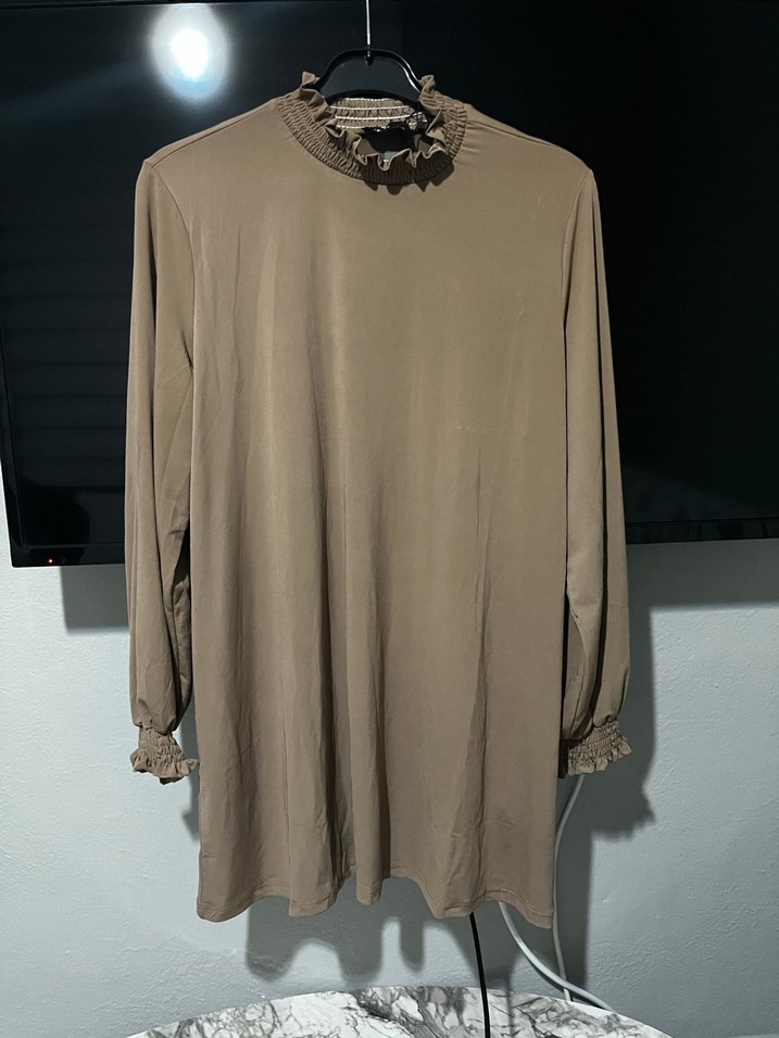 Bej renkte, yüksek yakalı ve yakada ile kollarda fırfır detaylı uzun kollu tuniği ve bol paça pantolonu Rahat kesim ve yumuşak sentetik kumaştan üretilmiştir, günlük sokak stiline uygundur. Hiç kullanılmadı etiketli ürün