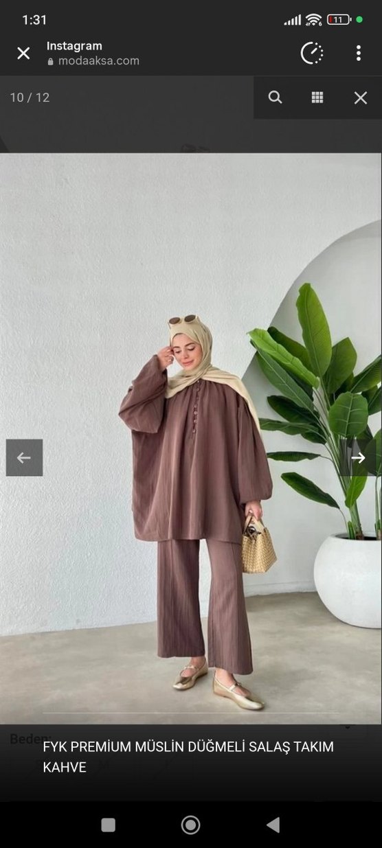 Fyk Premium Müslin Düğmeli Salaş Takım Kahve müslin takımdır salaş bol kesimdir üst beden kimono boy 76 cm balon düşük kol 50 cm göğüs 170 cm alt beden pantolon boy boy 99 cm basen 112 cm bel 46 cm baldır 64
