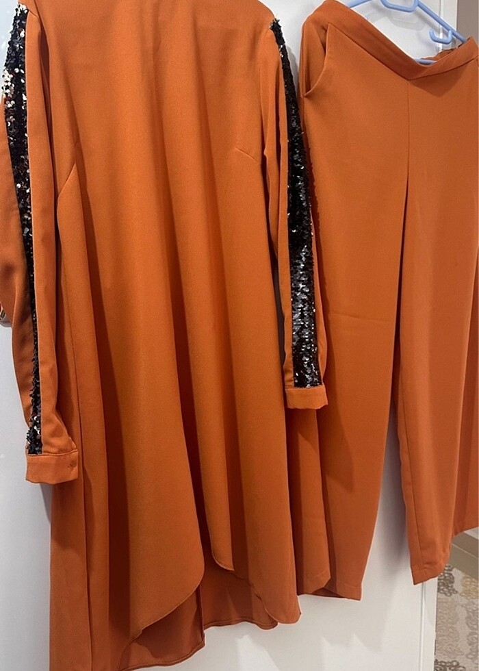 Taba rengidir. Kolları payet detaylı. Her hangi bir yırtık sökük yok. Düğün de giydim sayılı kullanıldı yepyeni duruyor. Kumaşı ütü istemez. Yıka kurut giy. Tunik arkası fermuar yarıya kadar açılıyor. Pantolon cepleri mevcut ve pantolon beli lastiklidir. 44 bedendir. Siyah kendinden hafif parlaklık olan şalı ile gönderim yapacağım. Rengi kiremit rengi gibidir.