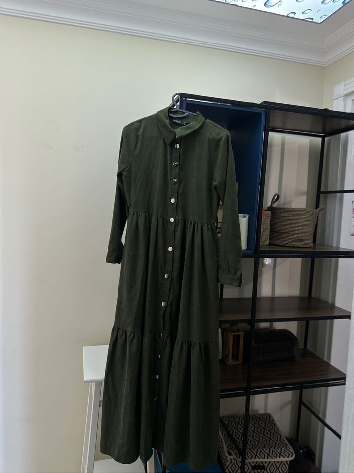 tesettür. Kadınlar için haki uzun keten elbise, bol kesim, uzun kollu ve düğmeli ön detaylıdır. Notlu yaka ve desensiz, günlük kullanıma uygundur.