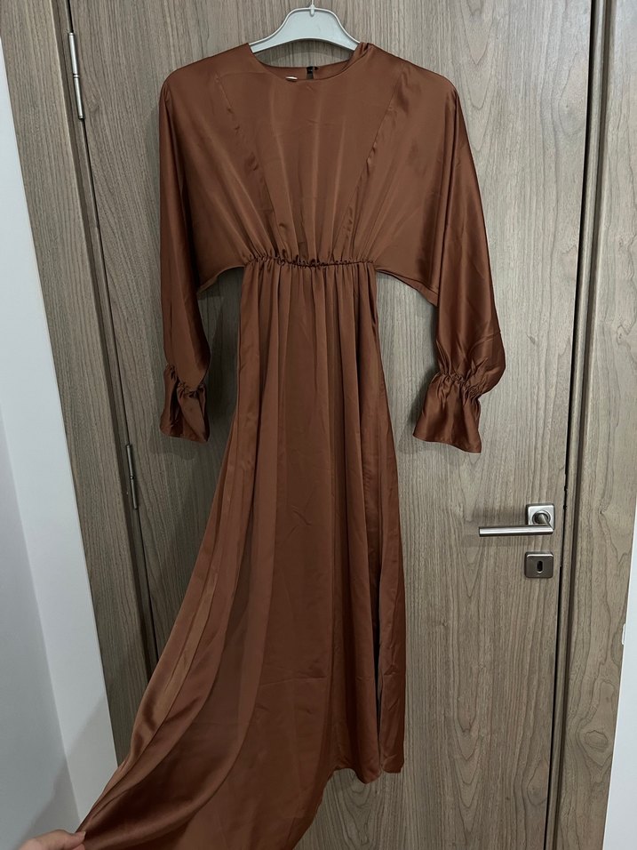 Kahverengi uzun elbise, satenimsi kumaş, salaş kesim ve drapeli tasarıma sahiptir. Uzun kollu ve yuvarlak yakalı, modern klasik ve minimalist şıklık sunar. Günlük kullanım için uygundur.