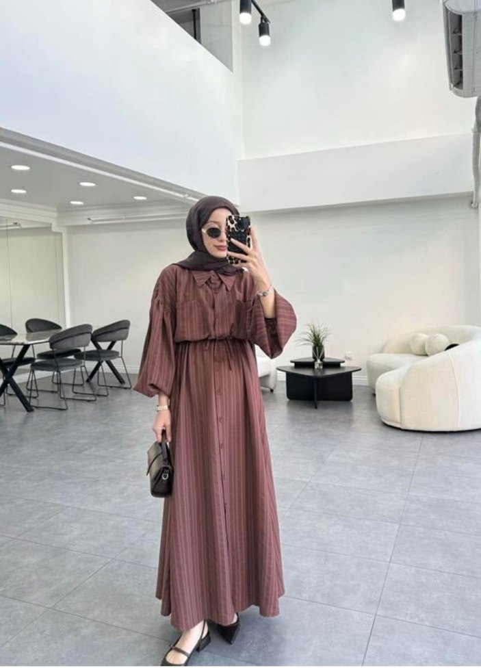 kahverengi, uzun salaş kesim, bel Kuşaklı, uzun kollu, yüksek yakalı ve hafif batik desenli günlük tesettür elbise. astarsızdır teni belli etmez rahatlıkla kullanabilirsiniz ebatı bol geldiği için satıyorum