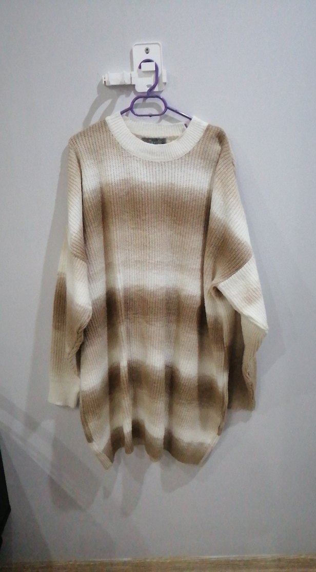 Bej ve gri batik desenli, örgü kumaştan, uzun kollu, yuvarlak yaka, salaş kesim kadın kazak. Günlük kullanım için uygundur.