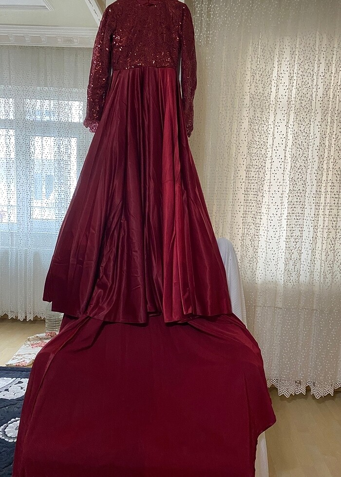 Kendi kınamda sadece 2-3 saat kadar giydim hiç bir sorunu yoktur özel dikim yaptırmıştım 40 beden üstü payetli kumaşı satendir bordo kırmızı arası bir ton sık pileli kuyrukludur sırtında fermuar mevcut