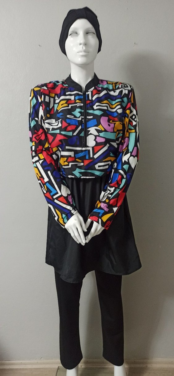 Renkli soyut desenli, fermuarlı ve uzun kollu, kısa kesim kadın mayo. Günlük kullanım için uygundur.
