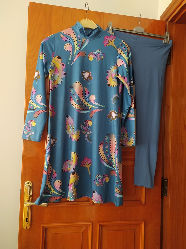 Ürün yeni etiketlidir hiçbir sorunu yokdur üst iç camasıri dahildir bonesi vardır boynu tam kapalıdır bone ilede kullanılır esnek kumaşdır üst boyu 90 cm alt boyu ,83 cm iki kol altı göğüs tek yön 45 alt kısmı tayttır 36-38 uygundur