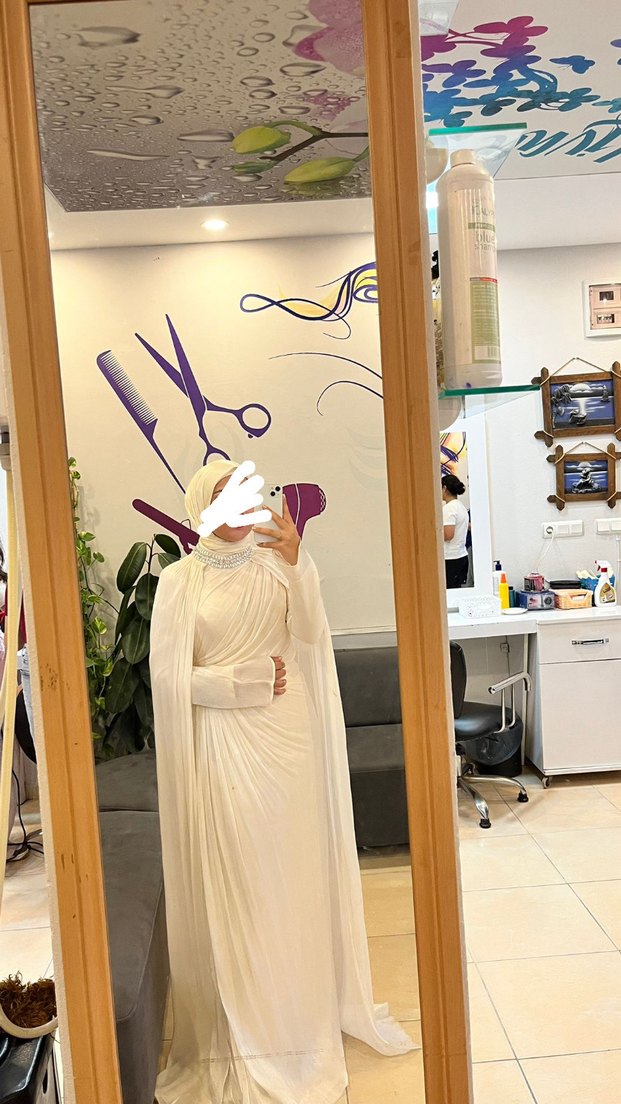 Uzun boy, beyaz renkte, yüksek yakalı ve uzun kollu drapeli kadın elbisesi. Bohem ve avangard tarzda, sade ve düzenli kesime sahip.