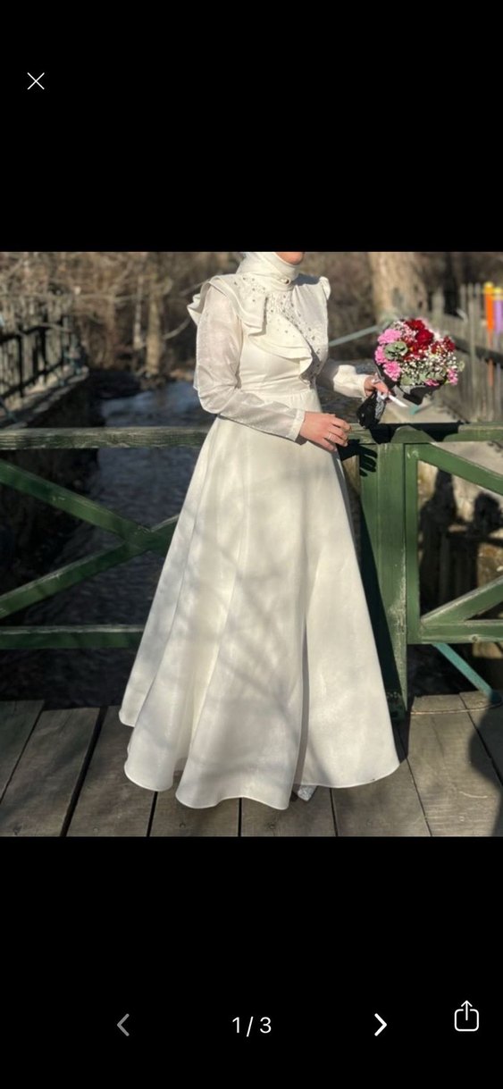 Uzun kollu, yüksek yakalı beyaz gelinlik, klasik zarafeti vintage tarzla buluşturan A kesim modeldir.