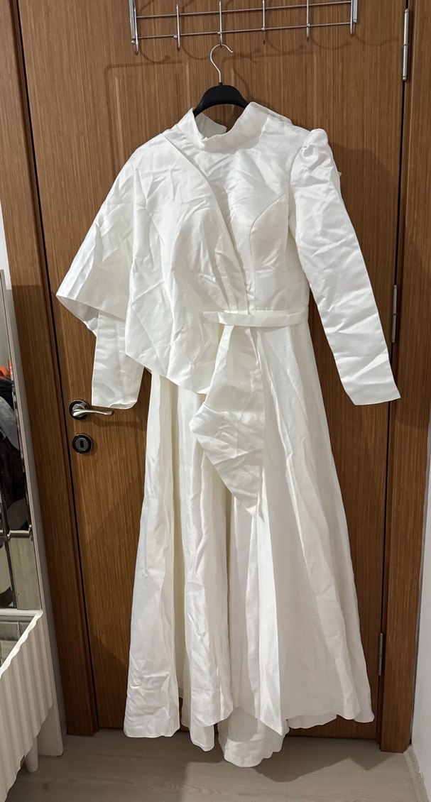 Vintage tarzda, uzun kollu ve uzun boylu kadın elbisesi. Beyaz, desensiz kumaştan yapılmış klasik kesim bir model. Silikonu biraz çıkmış tekrar yapıştırabilirsiniz, resimde hafif bir leke var çıkar mı bilmiyorum, şalda da fondöten lekesi var çıkar mı bilmiyorum. Fiyata yansıttım. Beden olarak ise 38-40 arasındadır. Daha çok 40 bedenler tercih edebilir.