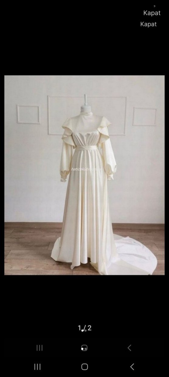 Uzun beyaz drapeli gelinlik, balıkçı yaka ve uzun kollu tasarıma sahiptir. Regular fit olup modern klasik ve vintage şıklık sunar. ️