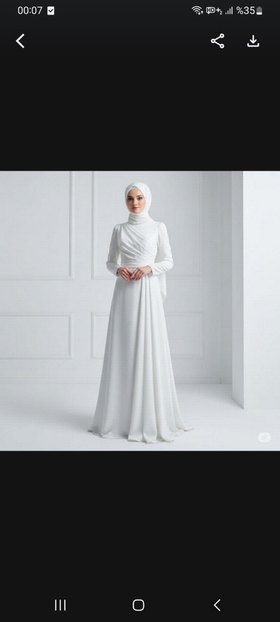 Beyaz renkte, uzun kollu, yüksek yakalı ve drapeli tasarıma sahip uzun abiye. Minimalist ve desensiz, düğünler için uygun klasik kesim.