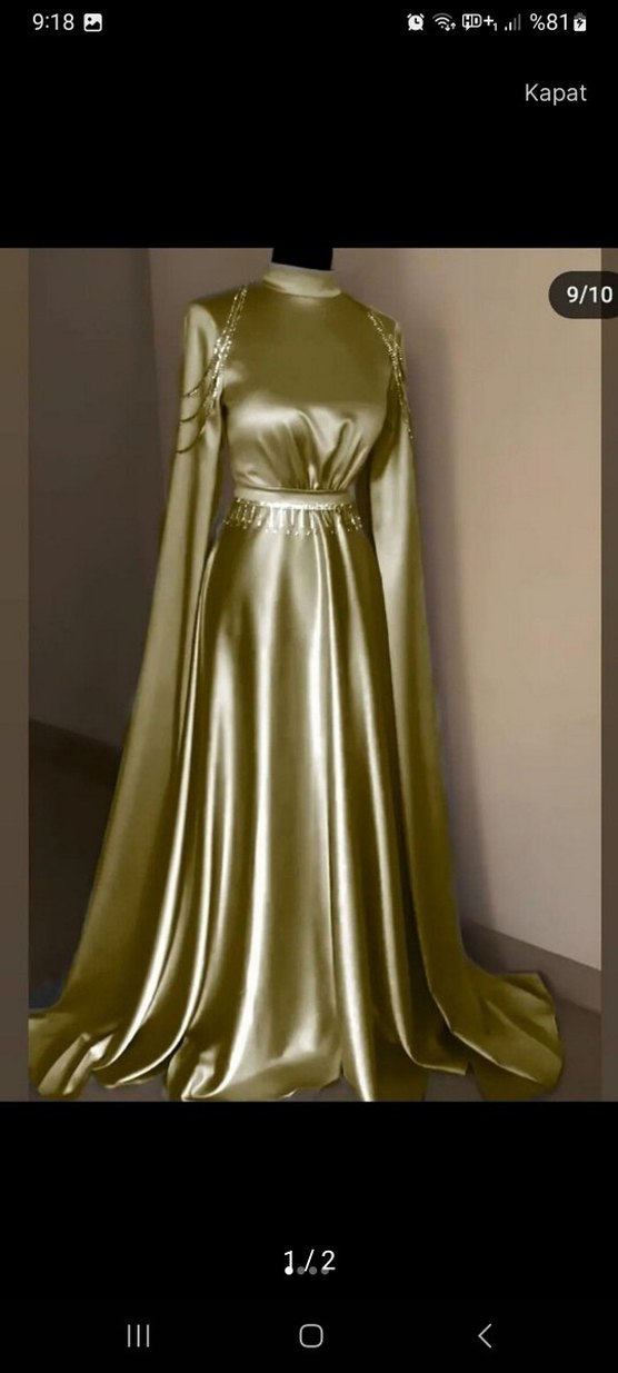 Uzun, straplez, parlak altın renkli bu abiye elbise, drapeli tasarımı ve regular fit kesimiyle düğünler için uygundur. Kolsuz ve klasik şık goth tarzında bir modeldir. ✨