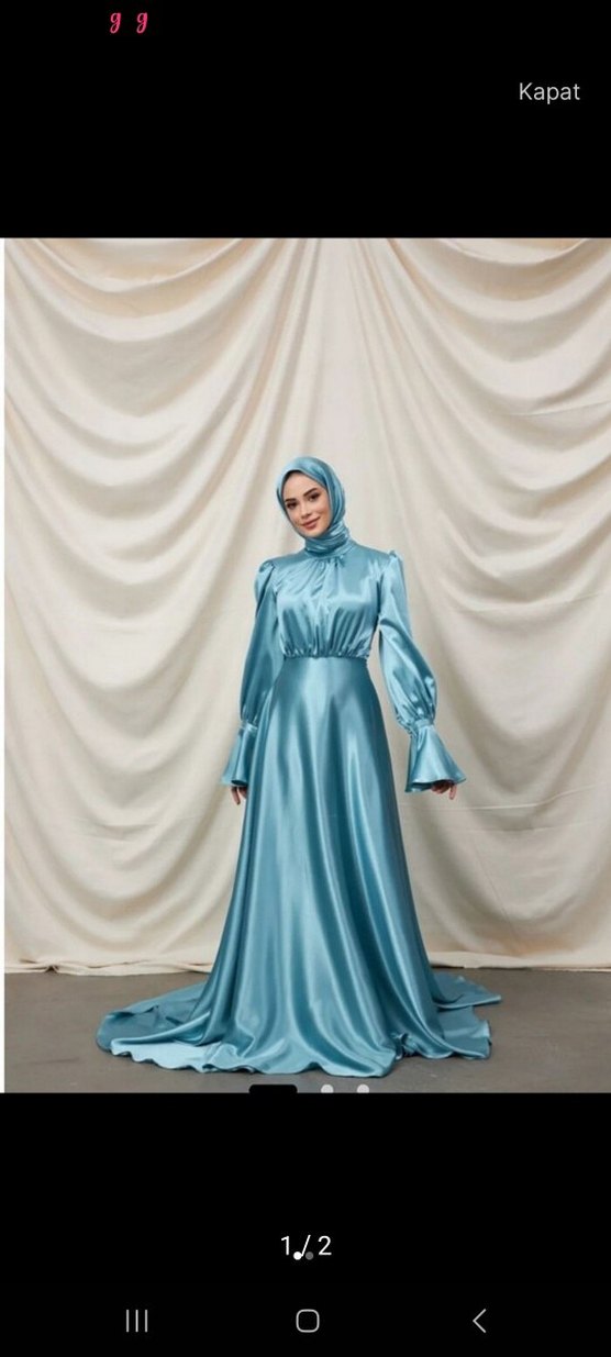 Parlak turkuaz renkte, yüksek yakalı, uzun kollu ve drapeli, tesettürlü, uzun boy abiye elbise.